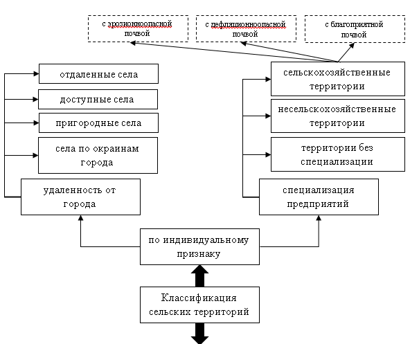 Для наиболее эффективного управления сельскими территориями необходимо рассматривать их в разрезе индивидуальных особенностей каждой территории. Группы этих особенностей, признаков, можно выделить следующие: географические, социальные, экономические и др. В зависимости от выбранной категории доминирующих признаков будет изменяться и классификация сельских территорий.