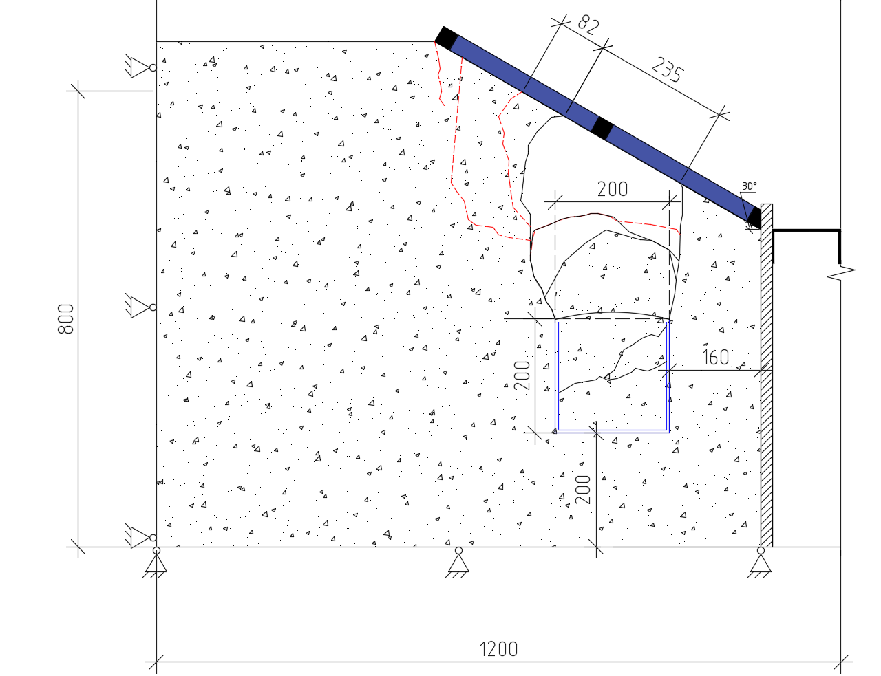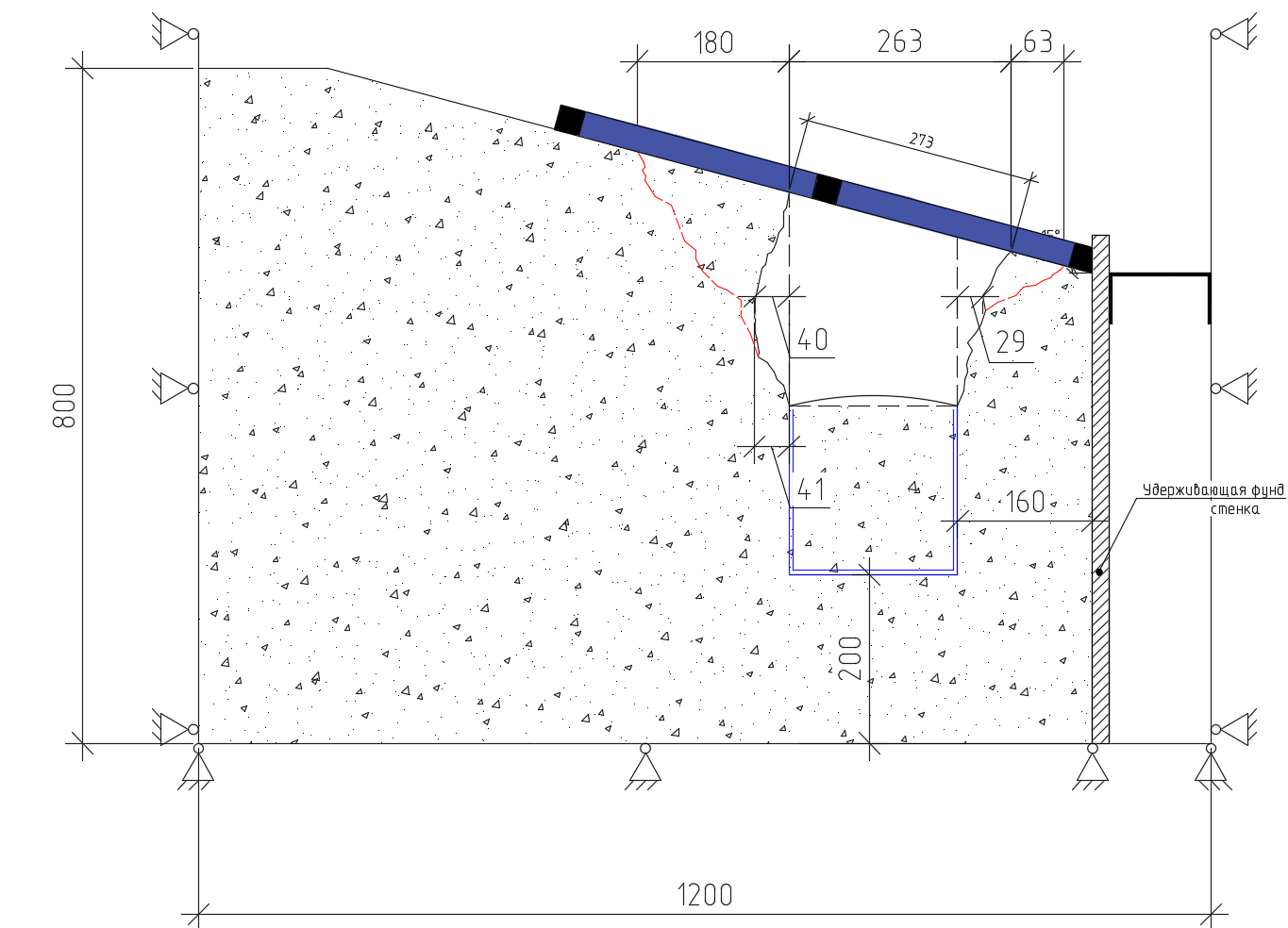 - По полученным схемам обрушения и развития трещинообразования можно утверждать, что при увеличении угла наклона основания развитие свода обрушения и характерных трещин в основании перемещается асимметрично в сторону верхней части склона, одновременно линии образующих свода обрушения смещаются в противоположную сторону от удерживающей конструкции фундамента.