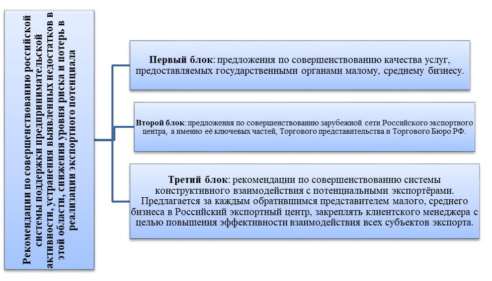 Третий блок: рекомендации по совершенствованию системы конструктивного взаимодействия с потенциальными экспортёрами. Предлагается за каждым обратившимся представителем малого, среднего бизнеса в Российский экспортный центр, закреплять клиентского менеджера с целью повышения эффективности взаимодействия всех субъектов экспорта.