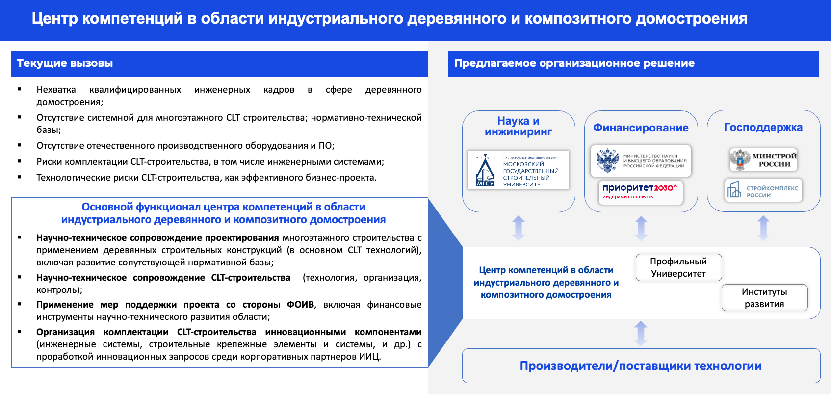 Одним из возможных инструментов комплексного решения указанных вызовов является создание Центра компетенций в области индустриального и композитного домостроения.