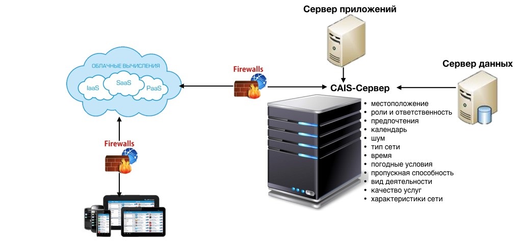 CAIS-сервер: обрабатывает данные, полученные от серверов приложений и баз данных, а также от мобильных клиентов, с фокусом на контекстно-зависимую обработку информации.