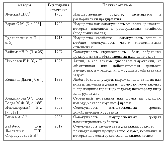 В экономической литературе встречаются разнообразные определения активов, представленные в таблице 1.