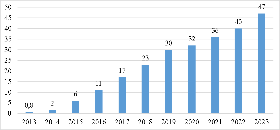 Безусловным лидером данных процессов можно назвать московскую карту «Тройка», которая в настоящий момент используется уже в 38 регионах России (к концу 2025 года планируется подключить еще как минимум 21 регион) [2], позволяющую оплачивать проезд на всех видах общественного транспорта и постепенно превращающуюся в полноценную платежную систему, которой возможно оплачивать не только транспортный проезд, но и проходы на выставки, в музеи и галереи, предъявлять ее при покупки в магазинах для получения кэшбека. С 2013 года было выпущено более 47 млн карт – рисунок 1.