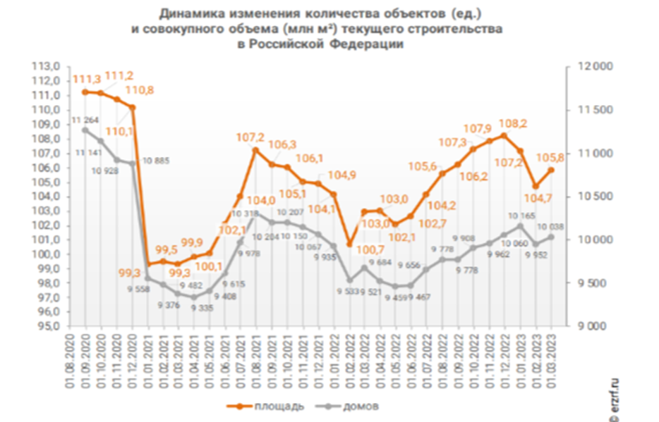 По данным аналитического отчета, подготовленного ООО «Институт развития строительной отрасли» по состоянию на 01.03.2023 г, показатели по строительству количества объектов и объема текущего строительства превышают аналогичный период 2022 года, что позволяет сделать вывод о начале восстановления темпов развития отрасли и активизации деятельности всех участников строительного процесса.