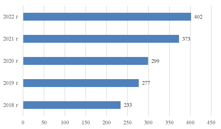Весьма положительную динамику демонстрирует темпы роста индивидуального строительства. Например, к концу 2022 года число построенных домов составило 402 тыс.шт., что существенно превышает уровень прошлых лет, что и показано на рисунке 3.