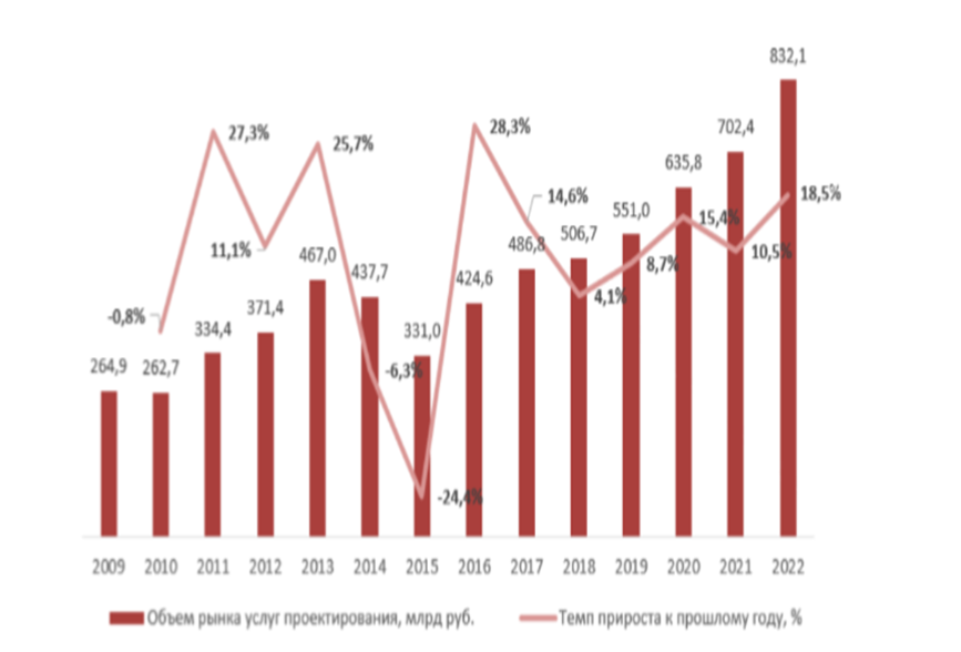 Весьма активными темпами в 2022 году по сравнению с данными за 2009 год происходит увеличение рынка услуг, связанных со строительным проектированием. Например, только к уровню прошлого года увеличение составило более 18% (рис.4).