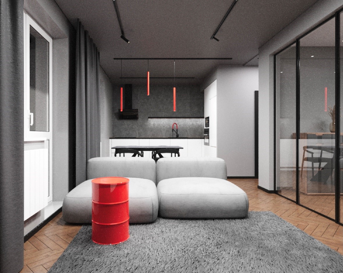 Красный цвет символизирует яркость и активность. В гамме с другими цветами он придает солидность окружающему пространству квартиры. Вместе с тем, его активность не дает заскучать как хозяевам, так и гостям. Красный цвет, находясь в контакте с расслабляющими и успокаивающими цветами, вносит небольшой огонь в композицию, рождая мистическую искру, способную стимулировать работоспособность людей внутри созданного интерьера. Этот цвет можно увидеть в потолочных светильниках кухни-гостиной, гибкой части смесителя над мойкой. В детской комнате установлен красный диван. Особенно необычно и ярко смотрится окрашенная в красный цвет бочка, которая выполняет функцию небольшого придиванного столика.