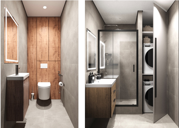 Для удобства проведения санитарно-гигиенических процедур было решено оставить раздельный санитарно-технический узел, который изначально был по проекту (рис. 3) [12-14]. Однако, провели некоторые дополнительные работы. Вместо стандартного унитаза со смывным бачком установили подвесной унитаз с инсталляцией, снабженный двумя кнопками смыва. Такое решение оправдано прежде всего тем, что стало более удобно проводить влажную уборку помещения. В пространстве рядом с унитазом установили рукомойник с однорычажным смесителем [15-17].