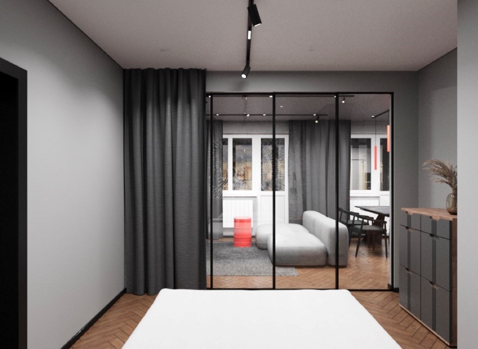 Вход в спальню осуществляется через кухню-гостиную (рис. 4). Было решено сделать стеклянную стену и дверь, чтобы обеспечить требуемый объем инсоляции, т.к. помещение не имеет собственных окон. При необходимости защиты от солнечного света повесили серые занавески.
