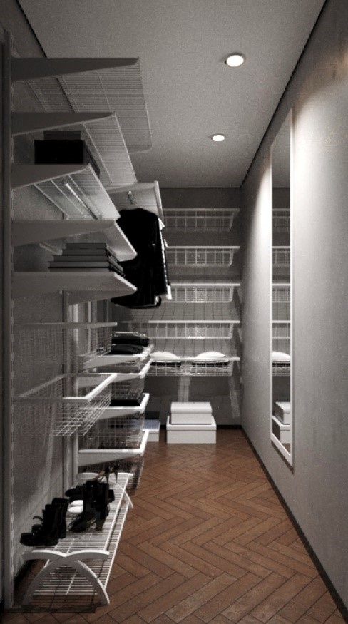 Из спальни можно выйти через дверь в гардеробную (рис. 5). Там организована удобная система хранения, которая крепится к стенам. В потолке установлены точечные светильники.