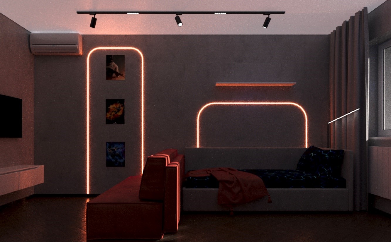 В детской комнате было решено украсить стены светодиодной подсветкой (рис. 7). В сумерках и при недостаточном освещении включение такого света дает определенную долю спокойствия, гармонии, утонченности и расслабления. Вместе с тем в таком представленном решении чувствуется определенная мистическая составляющая. Кажется, что подсветка напоминает вход в сказочный мир, где фантазии и вымыслы ребенка могут материализоваться.