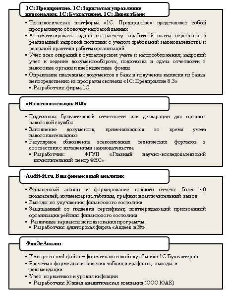 Расширенный спектр возможностей современных программных продуктов и их активное применение организациями всех видов экономической деятельности повышает точность получаемых результатов и их оперативность, обеспечивает скорость выхода информации в табличной и графической формах, обеспечивает своевременную корректировку методических расчетов и форм отражения конечного коммерческого результата. Не смотря на сложности развития отечественных цифровых технологий, на российском рынке информационных систем предлагается достаточное их количество; они зарекомендовали себя как эффективный инструмент, позволяющий собственникам, инвесторам, государству дать оценку итогам функционирования организаций, основываясь на данных производственной, финансовой и бухгалтерской отчетности. По большому диапазону используемых показателей и сформированным подходам к решению сложных задач оценки финансового состояния организаций, следует выделить программный пакет «1С: Бухгалтерия 8.3», программный пакет «Audit Expert», программный ресурс «ФинЭкАнализ», приложение «АБФИ-предприятие» и другие, которые нашли широкое применение в различных организациях (рисунок 2), а также автоматизированные информационные системы «Глобас», ТестФирм, СПАРК, Ру-стат, которые применялись для формирования объектной базы данного исследования (рисунок 3).