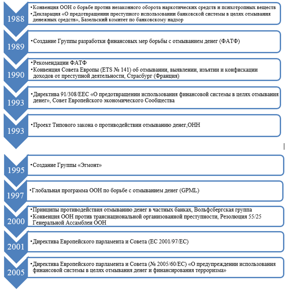 Далее на рисунке представлены основные этапы развития международных правовых документов в области противодействия легализации незаконных доходов.