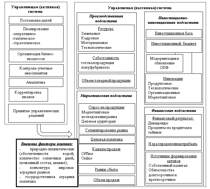 Процесс управления является воздействием целенаправленным и сознательным на объекты управления, для получения ими, в результате, запланированных эффектов деятельности. Классический подход к управлению, предполагает наличие в системе двух элементов: управляющего (активного) и управляемого (пассивного). В соответствии с вышеуказанным принципом классического подхода, приведем схематическое изображение системы управления организацией, основная операционная деятельность которой связана с сельскохозяйственным производством (Рисунок 1).