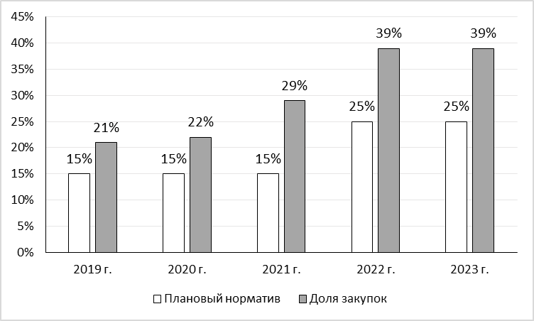 Рис. 2. Анализ доли закупок, осуществленных у СМП и СОНО в 2019-2023 гг., %. [21]