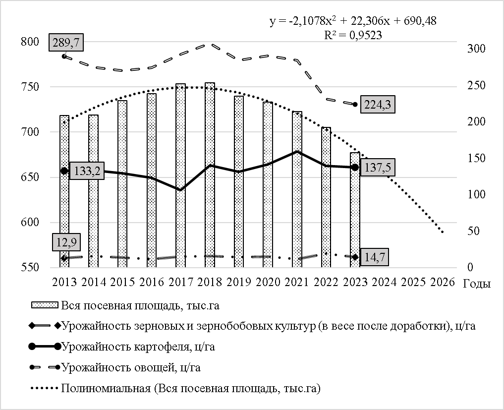 Изменения в посевных площадях влияют на общий объем производства продукции сельского хозяйства. Однако, чтобы полностью оценить такое влияние, необходимо рассмотреть урожайность как ключевой показатель эффективности сельскохозяйственного производства. В период с 2013 по 2023 гг. урожайность зерновых и зернобобовых культур претерпела значительные колебания. На начало анализируемого периода она составляла 12,9 ц/га, а в 2022 г. достигла пикового значения - 19,3 ц/га. При этом, минимальная урожайность исследуемых культур зафиксирована в 2016 г. и составила всего 11,8 ц/га. Объем производства овощей с единицы посевной площади показывает переменчивый тренд с постепенным увеличением с 289,7 до 308 ц/га по состоянию на 2018 г. В 2023 г. данный показатель снизился до значения 224,3 ц/га. Урожайность картофеля также показала нестабильность. Минимальное значение отмечено в 2017 г. - 106,3 ц/га, а пик урожайности пришёлся на 2021 г. - 159,4 ц/га. Такие статистические данные свидетельствуют о неравномерном использовании посевных площадей на фоне ухудшения климатических условий, истощения и неплодородности почвы (рис.2).