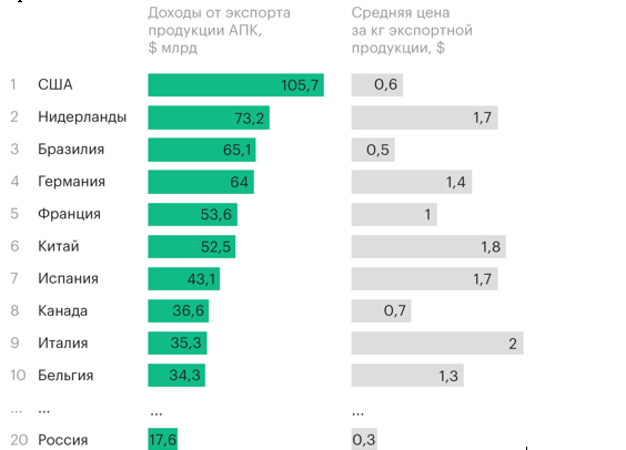 Рисунок 2 - Доходы от экспорта продукции агропромышленного комплекса стран мира ($ млрд) и средняя цена кг экспортной продукции ($) за 9 мес. 2018 г.