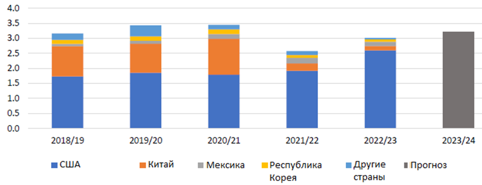 Беспрецедентно высокий экспорт агропромышленной продукции из США является достаточно диверсифицированным (рисунок 3). Помимо сои, являющейся основой аграрного экспорта, американские производители активно торгуют кукурузой и пшеницей, а также широким ассортиментом продукции животноводства (свинина, мясо КРС и птицы, молочная продукция и т.д.). Валовой объем американского экспорта продовольствия вплотную приблизился в 2022 г. к цифре 0,2 $трлн.