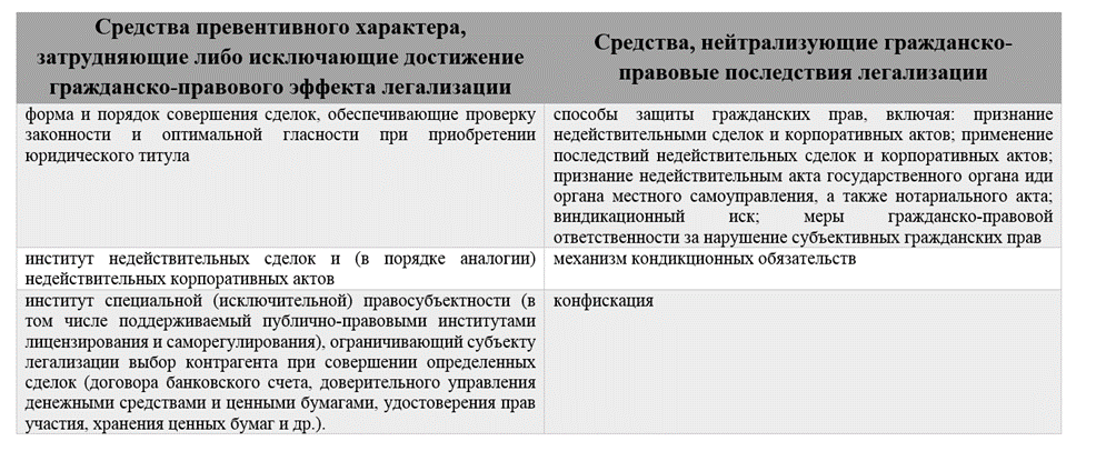 Таким образом, объектами легализации выступают объекты гражданского оборота. То есть в контексте борьбы легализации с точки зрения гражданско-правового регулирования необходимо рассмотреть способы противодействия этим действиям и минимизации последствий для легального гражданского оборота. Частно-правовые средства противодействия легализации представлены на рисунке.