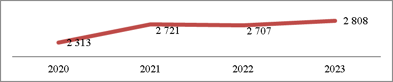 Рисунок 3 - Динамика количества резидентов технопарков РФ в 2020 – 2023 гг., единиц [6]