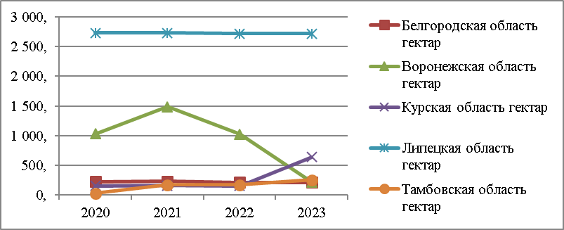 Рисунок 10 - Динамика площади территорий промышленных технопарков регионов ЦЧЭР в 2020-2023 гг., га [6]