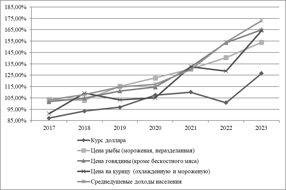 За последние три года наблюдается устойчивый рост цен на все виды продукции агропромышленного комплекса. Следует отметить, что цены на рыбу находятся между высокими ценами на говядину и более низкими ценами на мясо курицы. Доходы населения также отмечены тенденцией роста и резким ростом курса доллара в 2023 году.