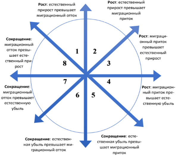 На перовом этапе были определена типология динамики численности населения в РФ и ее регионов на основе показателей естественного и миграционного прироста. В зависимости от преобладания того или иного типа прироста (убыли) над другим выделяют восемь типов, характеристики которых представлены на рисунке 1. Благодаря такому разделению можно оценить особенности формирования населения в определенном регионе за отдельный временной период [2].