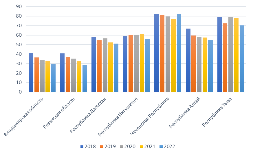 Культурно-исторические особенности обуславливают высокие значения данного показателя в Чеченской республике и республике Тыва – почти в 2 раза превышающие среднее значение по РФ.