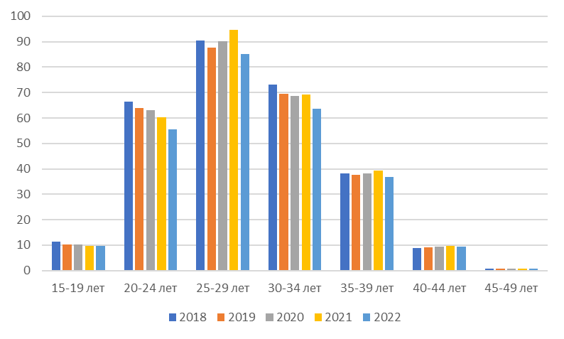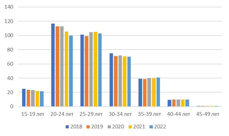 Снижение значений всех возрастных коэффициентов в 2022 году вероятно связано с общим снижением рождаемости, поскольку потенциал рождений у матерей, рожденных в конце 70-х-начале 80-х годов прошлого века, к этому моменту уже был исчерпан. Небольшой пик рождаемости (данные официальной статистики) [4], пришедшийся на середину 10-х годов XXI века, был обусловлен именно этими женщинами, а стимулирующие меры поддержки государства, такие как материнский капитал, положительно сказались на общей картине рождаемости в этот период.