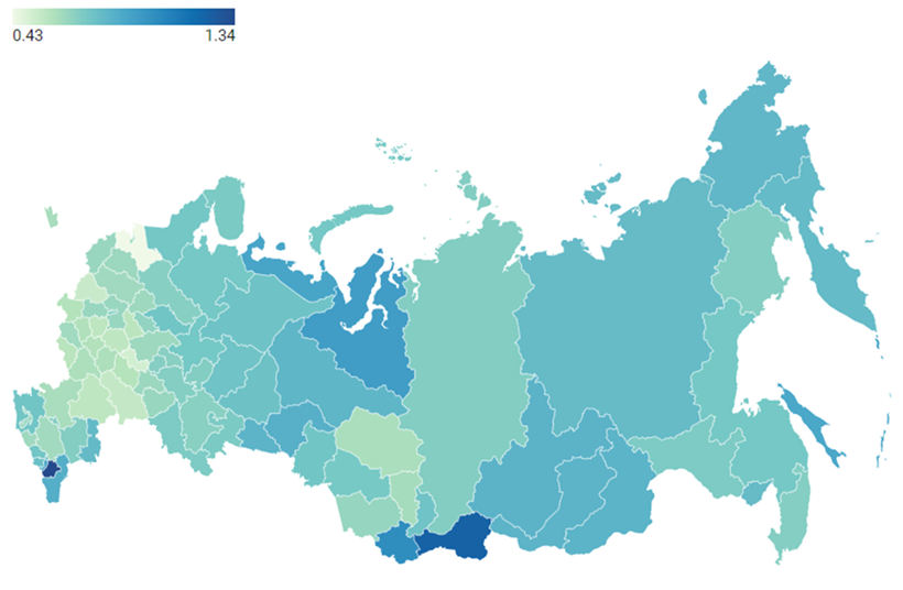 Рис. 2. Специальные коэффициенты рождаемости в регионах РФ