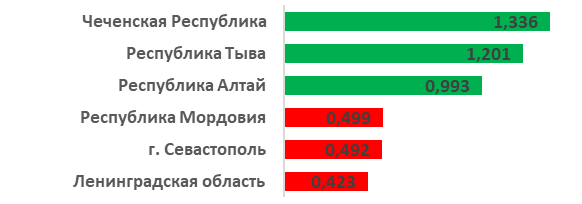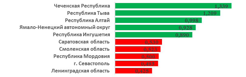 Регионы с расширенным воспроизводством представлены Чеченской республикой, Тывой, и республика Алтай, где значение нетто-коэффициента составило 1,4. Аутсайдерами выступают Смоленская, Тамбовская, Тульская и ряд других регионов Центрального ФО. Самым низким оказалось значение для Ленинградской области.