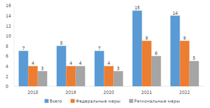 В течение анализируемого периода 2018-2022 гг. в рамках направления «Животноводство» действовали 17 мер государственной поддержки, из них 10 федеральных мер и 7 региональных [8].