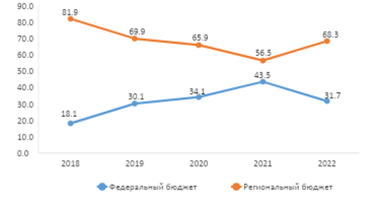 В целом за анализируемый период в структуре финансирования мер господдержки, основной удельный вес занимают средства регионального бюджета (68%) [14]. При этом наблюдается тенденция снижения доли регионального финансирования (с 81,9% в 2018 г. до 68,3% в 2022 г.) и увеличения доли федерального финансирования (с 18,1% в 2018 г. до 31,7% в 2022 г.) [15].