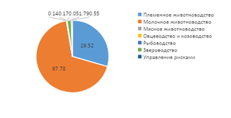 В структуре финансирования мер господдержки по направлению «Животноводство» более 97% от общего объема финансирования составляют меры поддержки, объединенные в блоки: «Племенное животноводство» (29,5%), «Молочное животноводство» (67,8%) [16].