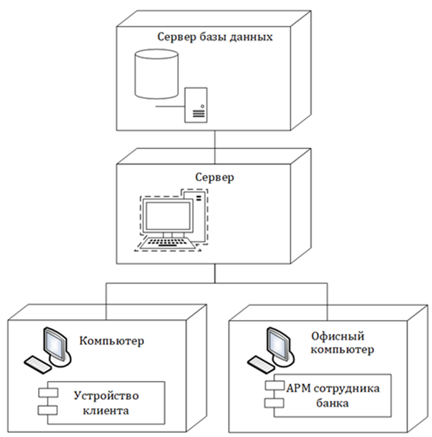 Диаграмма иллюстрирует отношения между объектами системы. Клиент вводит данные, которые необходимы и представлены в форме ввода информации для расчета предварительной оценки кредитоспособности. Форма ввода информации передает данные, введенные клиентом, в систему. Система генерирует запрос для расчета показателей обработчику информации. Обработчик информации выполняет необходимые расчеты, согласно запросу. Рассчитанные показатели записываются в базу данных. Обработчик информации формирует данные для вывода клиенту. Результат запроса передается системе, которая предоставляет отчет в форму вывода информации. Форма вывода информации выводит отчет клиенту. Клиент получает информацию. Данные, необходимые для последующего анализа, записываются в базу данных, доступ к которой есть только у сотрудника банка. Диаграмма развертывания представлена на рис. 3.