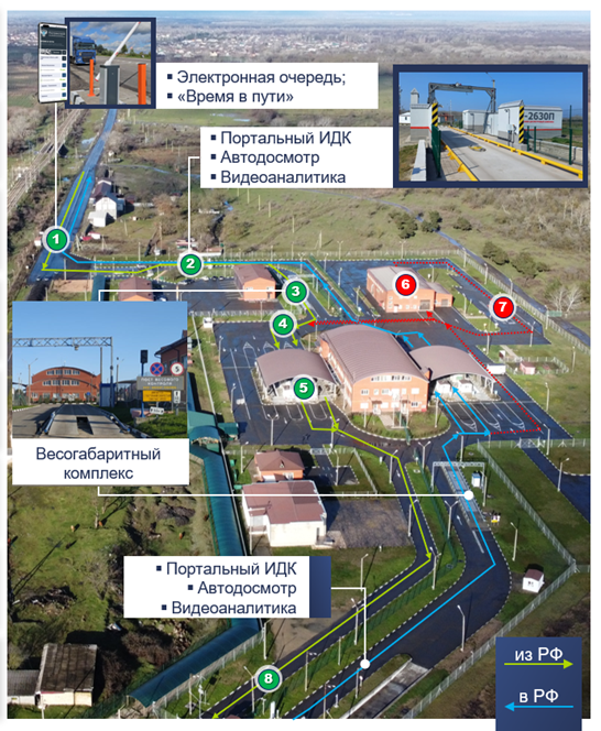 Рис. 2. Интеллектуальная система пропуска Тагиркент-Казмаляр с элементами диспетчеризации транспортных средств: 1 – до въезда в ИПП, 2 – «часовой шлагбаум», 3 – весовой и габаритный контроль, 4 – таможенный контроль, 5 – пограничный контроль, 6 – бокс углубленного досмотра, 7 – инспекционно-досмотровый комплекс, 8 – часовой шлагбаум (составлено по материалам, представленным на конференции «Интеллектуальный пункт пропуска в России и мире: компетентностный подход к созданию», проводившейся на базе Санкт-Петербургского филиала Российской таможенной академии в 2024 году)