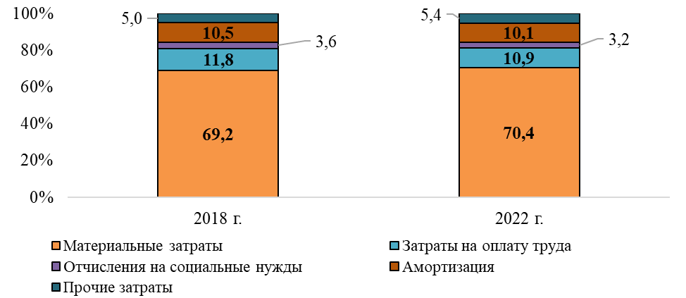 Все без исключения виды производственных затрат выросли за исследуемый период. В структуре производственных затрат наибольший удельный вес по итогам 2022 г. занимают материальные затраты – 70,4%, на долю оплаты труда с отчислениями приходится 14,1%, амортизации – 10,1%. Таким образом, структура производственных затрат в 2018-2022 гг. существенных изменений не претерпела, а именно: основными элементами на протяжении всего периода исследования являются материальные.
