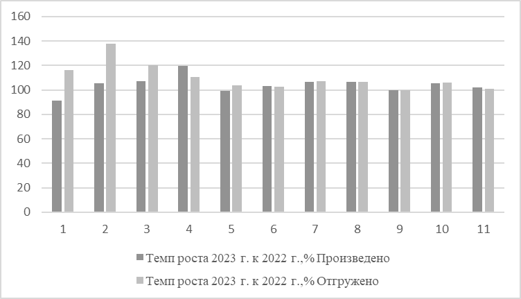 Рис. 1. Темпы роста произведенной и отгруженной сельхозпродукции %