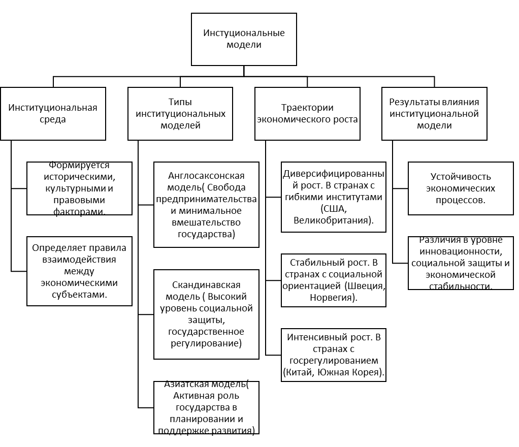 Институциональная теория подчеркивает, что экономический рост различных государств формируется под воздействием уникальных институциональных моделей. Эти модели, в свою очередь, зависят от исторических, культурных и правовых особенностей общества, что предопределяет различия в траекториях экономического развития. Каждая из моделей (англосаксонская, скандинавская или азиатская) имеет свои преимущества, адаптированные к специфике общества, и обеспечивает уникальные результаты в плане стабильности, инновационности и социальной защиты (рисунок 2).
