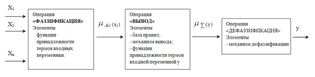 На входы нечеткой модели подаются четкие числовые значения Х1, Х2,…, Хn. Блок, выполняющий операцию или этап «ФАЗЗИФИКАЦИЯ» - далее фаззификатор, вычисляет значение степени принадлежности входной переменной Хi входным нечетким множествам Аij (i=1, 2,.., m; j = 1, 2,.., n). То есть фаззификатор переводит четкие значения входных переменных в их лингвистические значения. Для выполнения указанной операции блок фаззификации должен иметь доступ к точно определенным функциям принадлежности