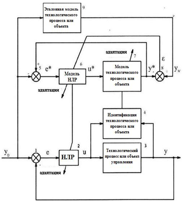 Нижняя часть данной структуры представляет собой замкнутую систему управления, состоящую из управляемого технологического процесса или объекта 3 и НЛР 2. Верхняя часть этой структуры — это модель реальной системы управления, включающая модель управляемого технологического процесса (или объекта) 7 и модель НЛР 6. Модель управляемого технологического процесса (или объекта) 7 настраивается на основе текущих значений замеров входного сигнала и выходного сигнала у. Обновленные значения параметров передаются в модель управляемого технологического процесса (или объекта) 7. Такая модификация (адаптация) параметров модели управляемого технологического процесса (или объекта) 7 активизирует алгоритм, настраивающий параметры модели НЛР 6. Для адаптации параметров модели НЛР 6 можно воспользоваться методом обратного распространения ошибки